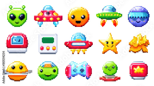 PNG Pixel Art Game Assets With Alien Spaceship Star Emoji And Console On Dark Background For Retro Gaming And App Development