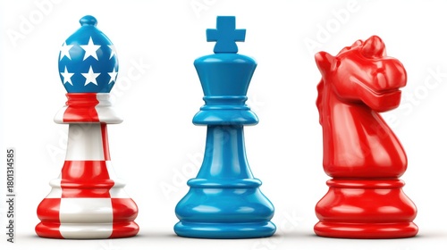Chess Pieces Bishop With American Flag Blue King Red Knight on White Background Strategy Competition Politics and Elections