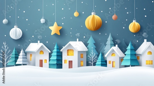 Winter Holiday Scene With Houses Trees Snow And Christmas Ornaments In Paper Cut Design For Festive Season And Celebrations