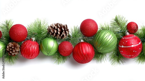 Christmas Garland With Red And Green Baubles And Pine Cones On White Background For Holiday Decorations And Festive Designs