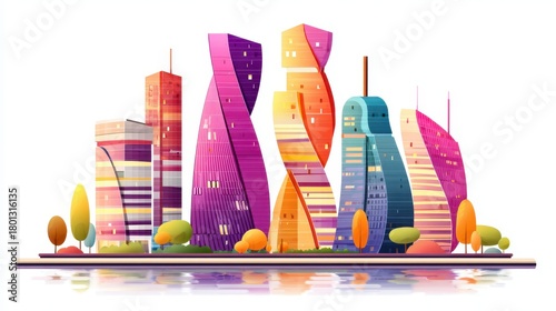 Colorful Cityscape Illustration With Modern Buildings Trees and Water Reflections on White Background for Urban Planning and Design Projects