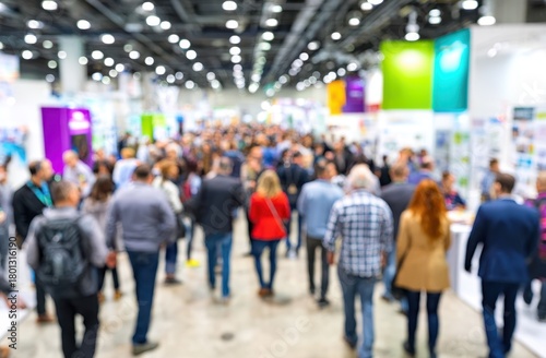 Blurred view of crowd of trade fair visitors in exhibiton hall