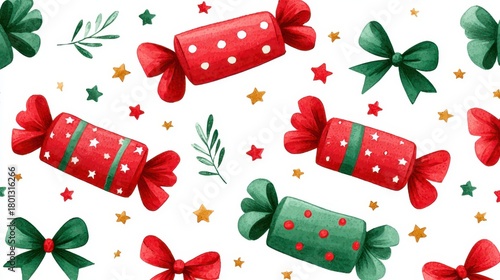 Festive Seamless Pattern With Watercolor Candy Bows And Stars On White Background For Christmas And Holiday Designs