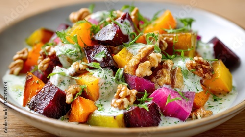 Colorful Beet Salad With Walnuts And Creamy Dressing In Bowl Healthy Food Photography For Restaurant Menus And Recipe Illustrations