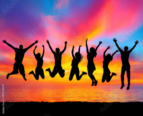 Silhouette Of People Jumping At Sunset Over Ocean With Arms Raised In Celebration And Happiness Showing Freedom