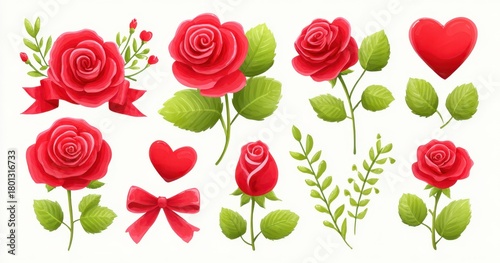 Red Roses And Hearts Isolated On White Background For Valentine's Day Wedding Anniversary Love Romance And Special Occasions Cards