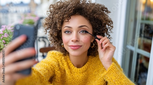 Woman Applying Mascara While Taking Selfie With Smartphone On Balcony With Flowers Beauty And Personal Care Concept Outdoor Setting