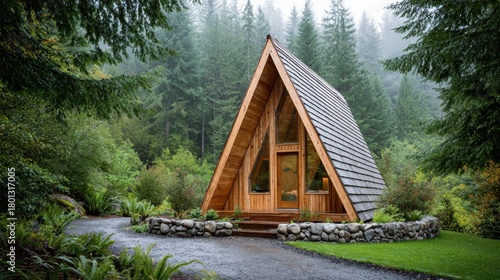 A-Frame Cabin Exterior With Wooden And Glass Windows In Forest Landscape Surrounded By Green Trees And Plants In Nature Setting