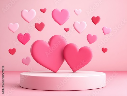 Pink Hearts Floating Above A Podium On Pink Background For Valentine'S Day Anniversaries And Romantic Celebration