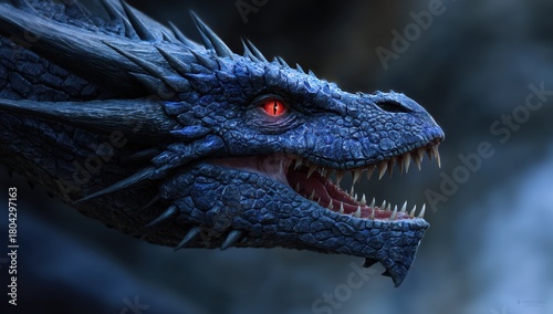 Detailed Close Up Of A Blue Dragon Head With Red Eyes And Sharp Teeth Fantasy Creature Illustration For Mythical