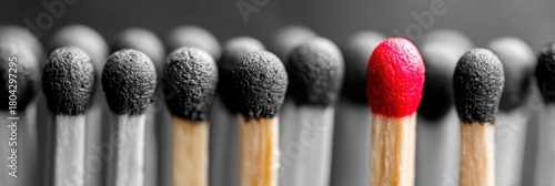 Red Match Among Black Matches Close Up Leadership Concept Standing Out From The Crowd Individuality Uniqueness