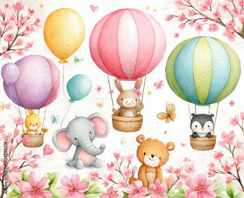 Watercolor Animals In Hot Air Balloons With Pink Flowers Illustration For Baby Shower And Nursery Decoration Projects On White