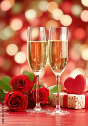 Champagne Flutes With Roses And Gift On Red Bokeh Background For Romantic Celebrations And Valentine's Day Events Anniversary Or Engagements