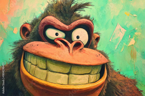Smiling cartoon gorilla with exaggerated grin on vibrant background