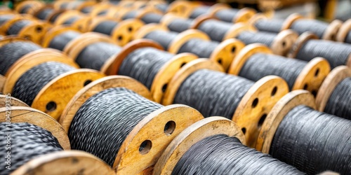 Rows Of Wooden Spools With Black Cable For Industrial Applications And Manufacturing Processes Showing Organization