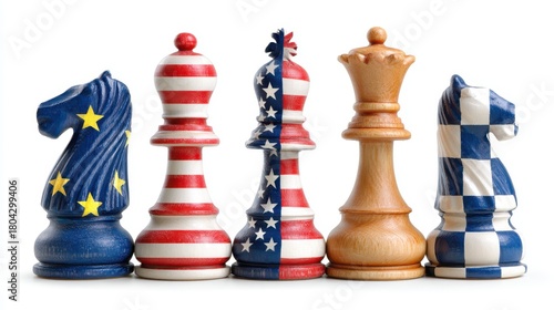 Chess Pieces Painted With Flags Of USA And European Union On White Background Depicting Political Strategy And International Relations