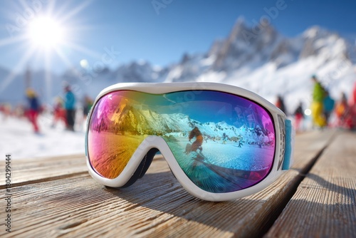 Ski Goggles With Colorful Lens Reflecting Snow Mountain Landscape On Wooden Table In Winter Season For Outdoor
