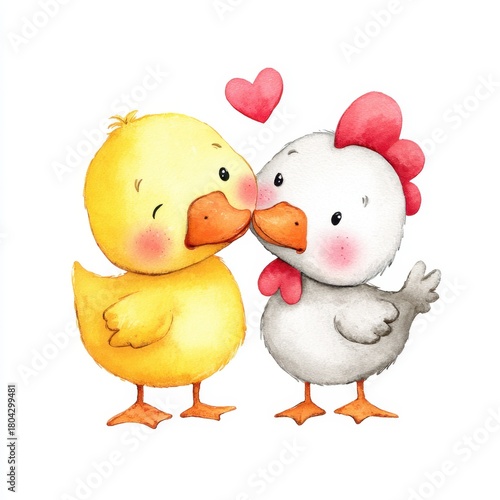 Watercolor Duckling And Chicken With Heart On White Background For Children's Illustration And Cute Animal Themed Designs
