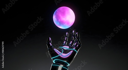 Futuristic black chrome robot hand reaching for a glowing neon sphere representing artificial intelligence, digital power, and advanced technology against a dark background. #1806217911