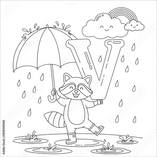 Cute raccoon coloring page. Rainy day alphabet illustration. Happy cartoon raccoon holding an umbrella and a letter V while jumping in a puddle under a rainbow. Fun coloring page for children. #1808440968