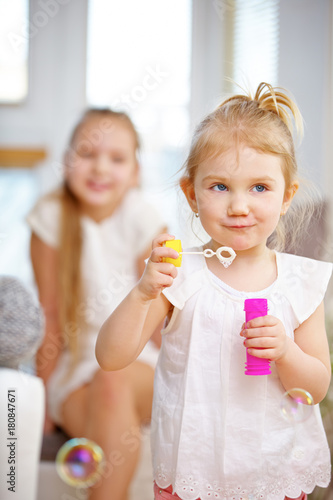 Mädchen pustet Seifenblasen zu Hause