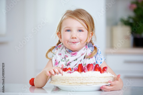 Kind mit frischer Erdbeertorte in Küche