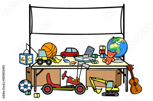 Leeres Banner mit Spielzeug und Trödel für Flohmarkt