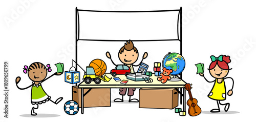 Cartoon Kinder verdienen Geld mit Spielzeug verkaufen auf Flohmarkt