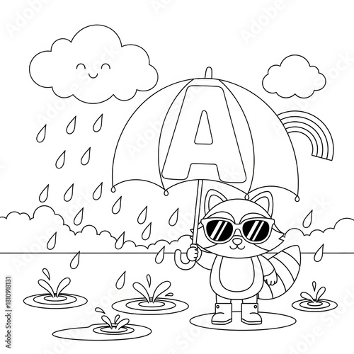 Cute raccoon coloring page. Rainy day cartoon animal letter A illustration. Happy raccoon holding an umbrella with letter A in a rain scene with rainbow. Fun alphabet printable activity sheet for kids #1810918131