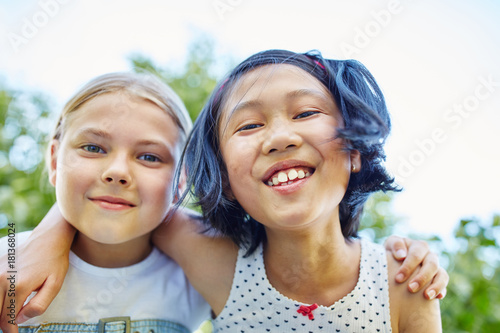 Handschlag vor vielen bunten Portraits einer Gesellschaft als Konzept für Miteinander