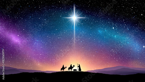 Merry Christmas Nativity Scene Illustration With Three Wise Men And Starry Sky For Holiday Greetings