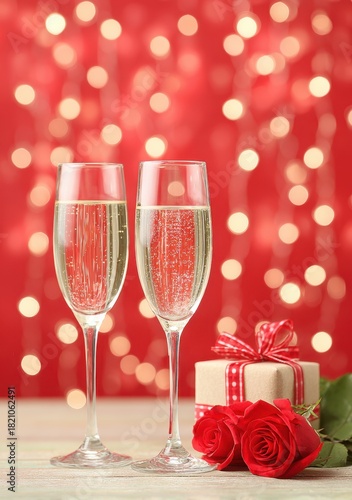Champagne Flutes With Roses And Gift On Red Bokeh Background For Romantic Celebrations And Valentine's Day Events Anniversary Or Engagements