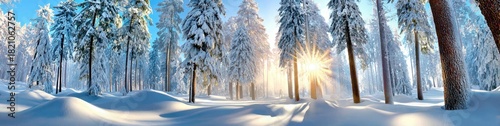 Snowy pine forest path bathed in sunbeams through tall trees in winter wonderland