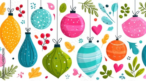 Seamless charming Christmas decorations including holly and ornaments in a cheerful pattern