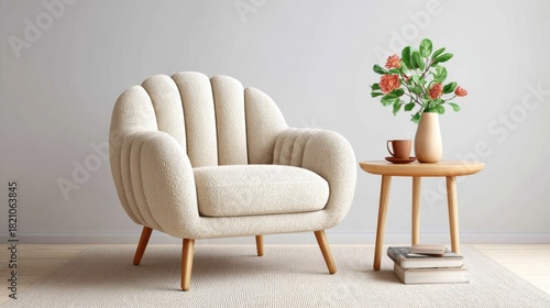 Cozy Armchair With Flowers On Table In Interior Setting Beige Tones Modern Home Decor Minimalist Design Comfortable Furniture And Relaxing Atmosphere