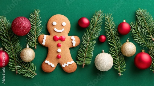 Gingerbread Man Cookie With Christmas Ornaments And Pine Branches On Green Background For Holiday Season And Festive Decorations