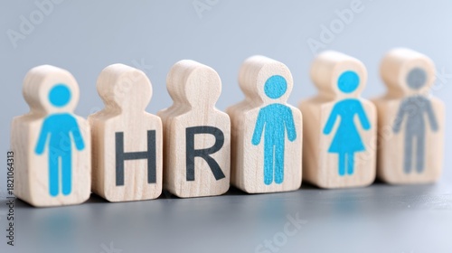 Wooden Figures With HR Letters And Gender Symbols In Blue And Gray Colors Representing Human Resources And Teamwork On Gray Background