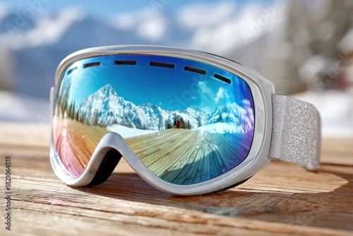 Ski Goggles Reflecting Mountain Landscape On Wooden Surface For Winter Sports And Outdoor Adventure Gear For Skiing And Snowboarding