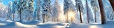 Snow Covered Pine Trees In Winter Forest Landscape With Sunlight And Blue Sky For Christmas Holiday Or Winter