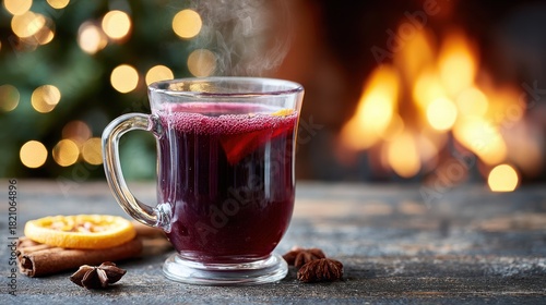 Steaming Mulled Wine In Glass Mug With Orange Slice Cinnamon Sticks And Anise Stars On Wooden Table For Christmas And Winter Holidays