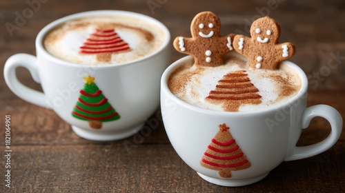 Festive Christmas Cappuccino With Gingerbread Men And Tree Art On Wooden Table For Holiday Season And Winter Celebrations