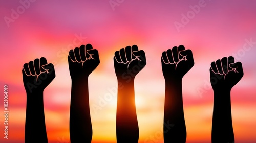 Silhouetted Fists Raised Against Colorful Sunset Sky Background For Protest Empowerment And Social Justice Concepts And Demonstrations