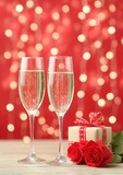Champagne Flutes With Roses And Gift On Red Bokeh Background For Romantic Celebrations And Valentine's Day Events Anniversary Or Engagements