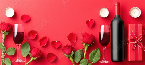 Romantic Red Wine Bottle Roses Gift Box Candles and Petals for Valentine's Day or Anniversary Celebration on Red Background