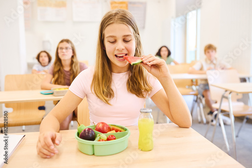 Student enjoying healthy snack with juice during a classroom break