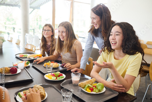 Students enjoying a healthy lunch together in a lively school cafeteria