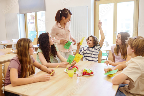 Group of students and teacher discussing in school cafeteria with educational cards