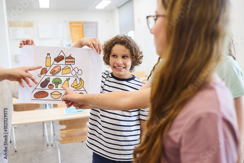 Teenagers discussing nutrition and healthy foods in a school classroom setting