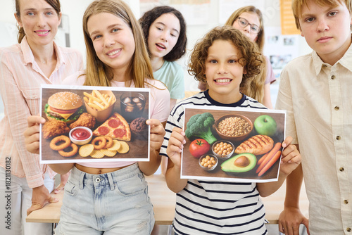 Teenagers discussing nutrition and healthy foods in a school classroom setting