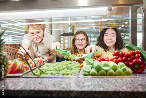 Children selecting fresh fruits and vegetables in a school cafeteria setting